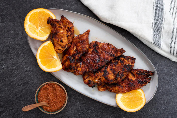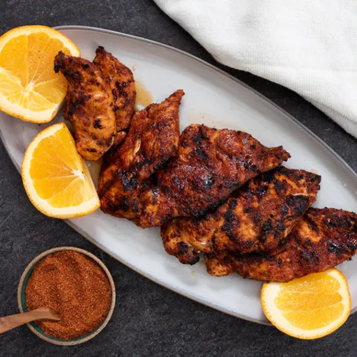 This is the perfect grilled chicken dish when you want to get dinner on the table quickly with no advance prep needed. Plus, it utilizes ingredients you likely have on hand. This dish has a little heat, but the fresh orange juice and drizzle of honey not only tames the heat, but provides a sauce as well as the chicken rests.