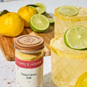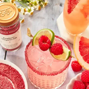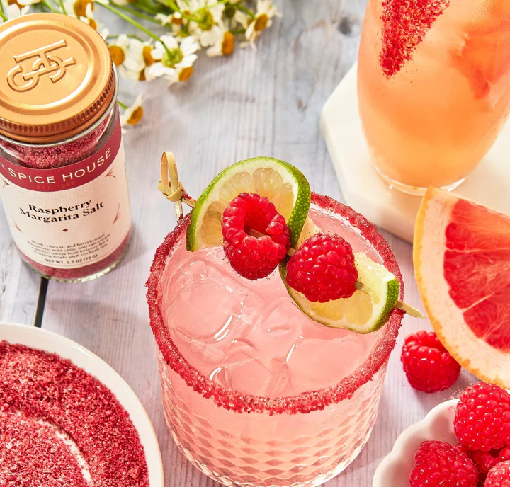 We love this twist on a classic margarita for the summertime! Complete with a fun, vibrant pink rim from our Raspberry Margarita Salt.
